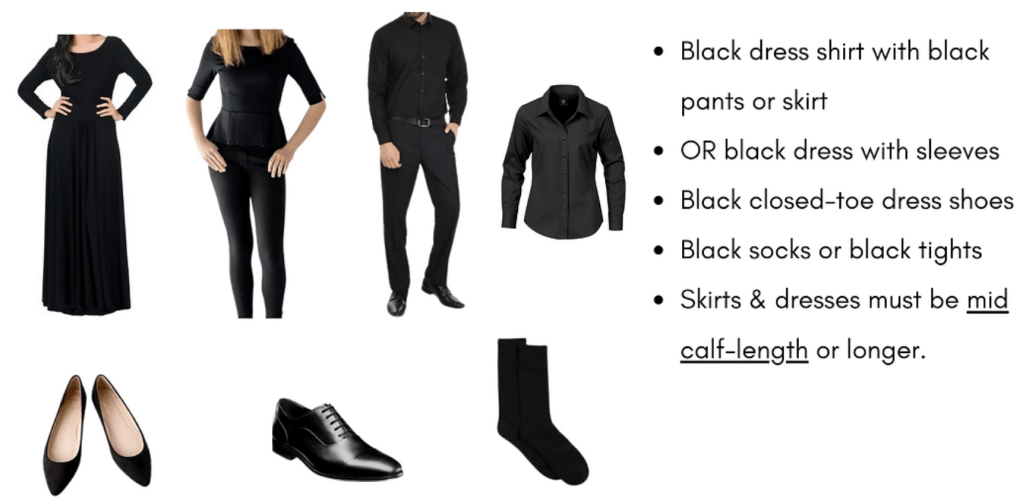 - Option 1: black closed-toe dress shoes, black socks that cover the ankles, black dress pants, black button-down long-sleeved shirt with collar, and black belt (black tie and jacket optional).